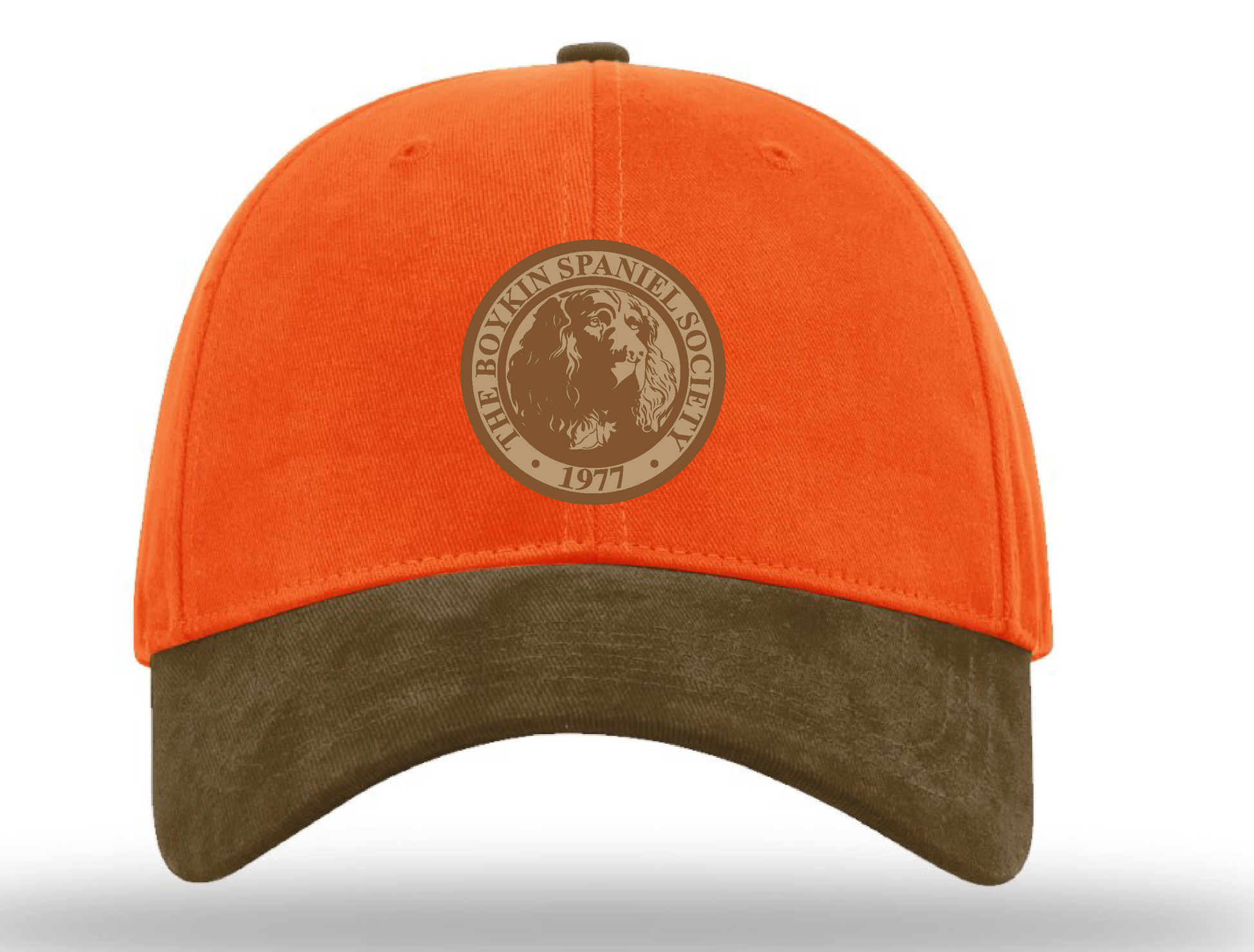This structured, blaze crown cap with Duck Cloth visor is a modern take on a classic look. Adjustable hook-and-loop backstrap offers sizing versatility. Adorned with a leather patch embossed with the Boykin Spaniel Society Official Seal. This hat is a high quality Richardson 884.