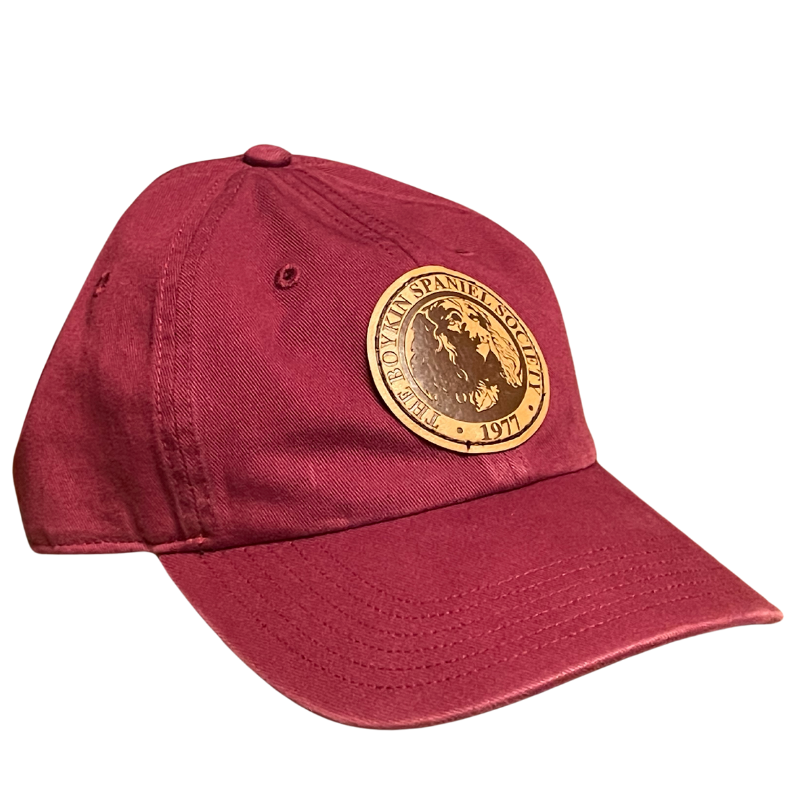 You'll love our "dad hat" in a heavyweight chino twill with an adjustable strapback backstrap. Cardinal color hat adorned with the official Boykin Spaniel Society seal embossed on a leather patch.