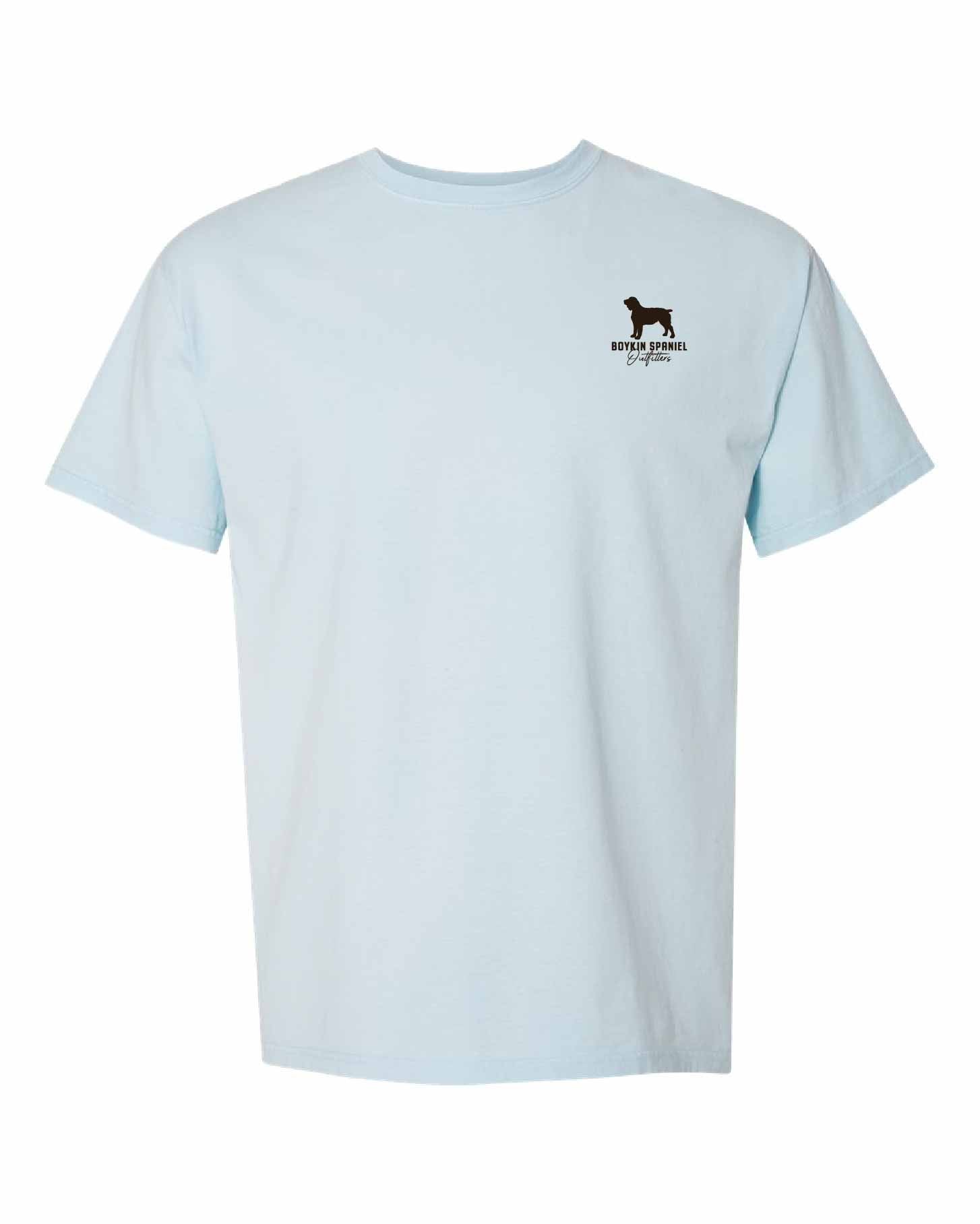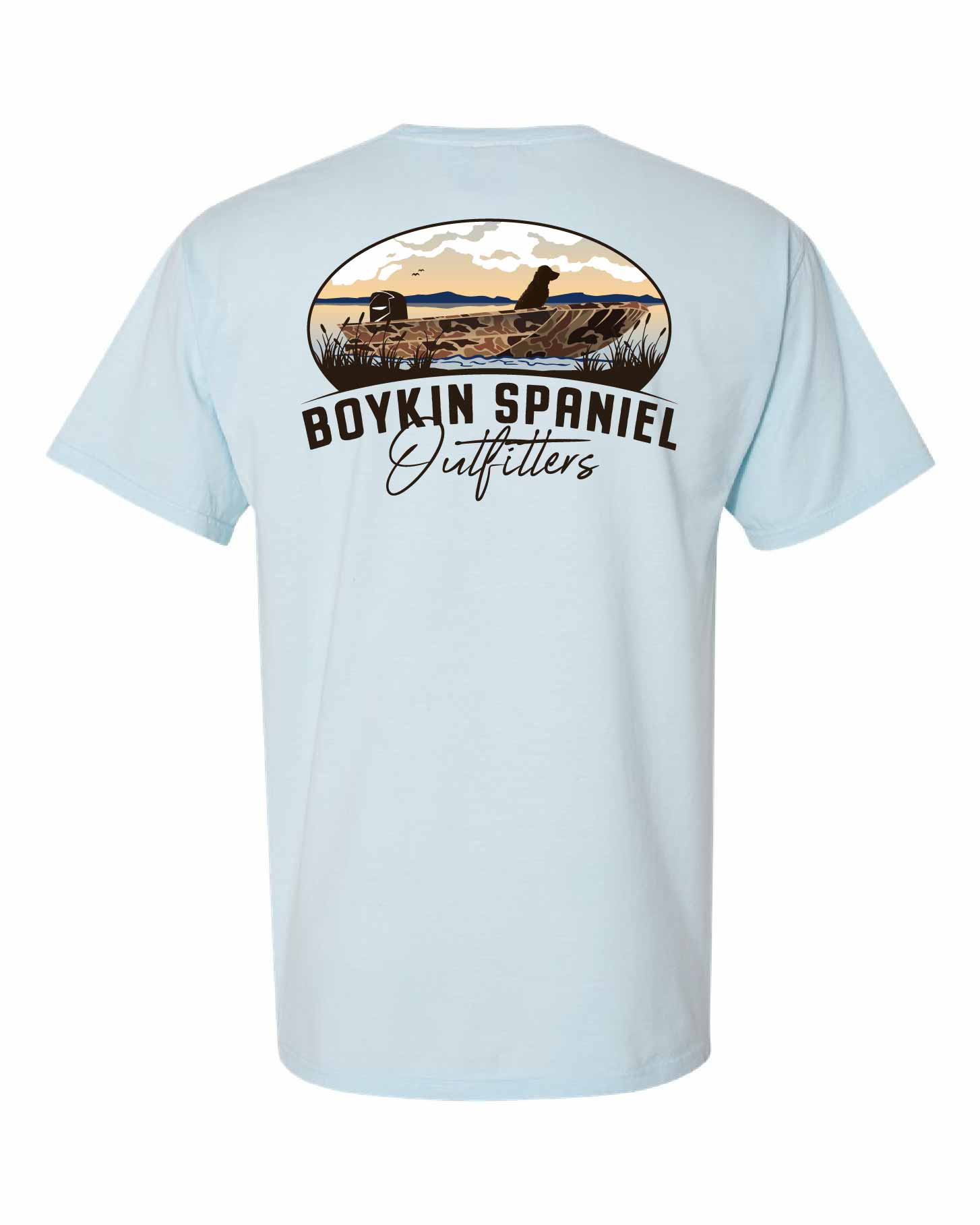 Hunters and non-hunters alike will love this shirt featuring a Boykin Spaniel in a duck hunting boat on the back! This is a 100% ring spun cotton t-shirt. In color: Chambray.
