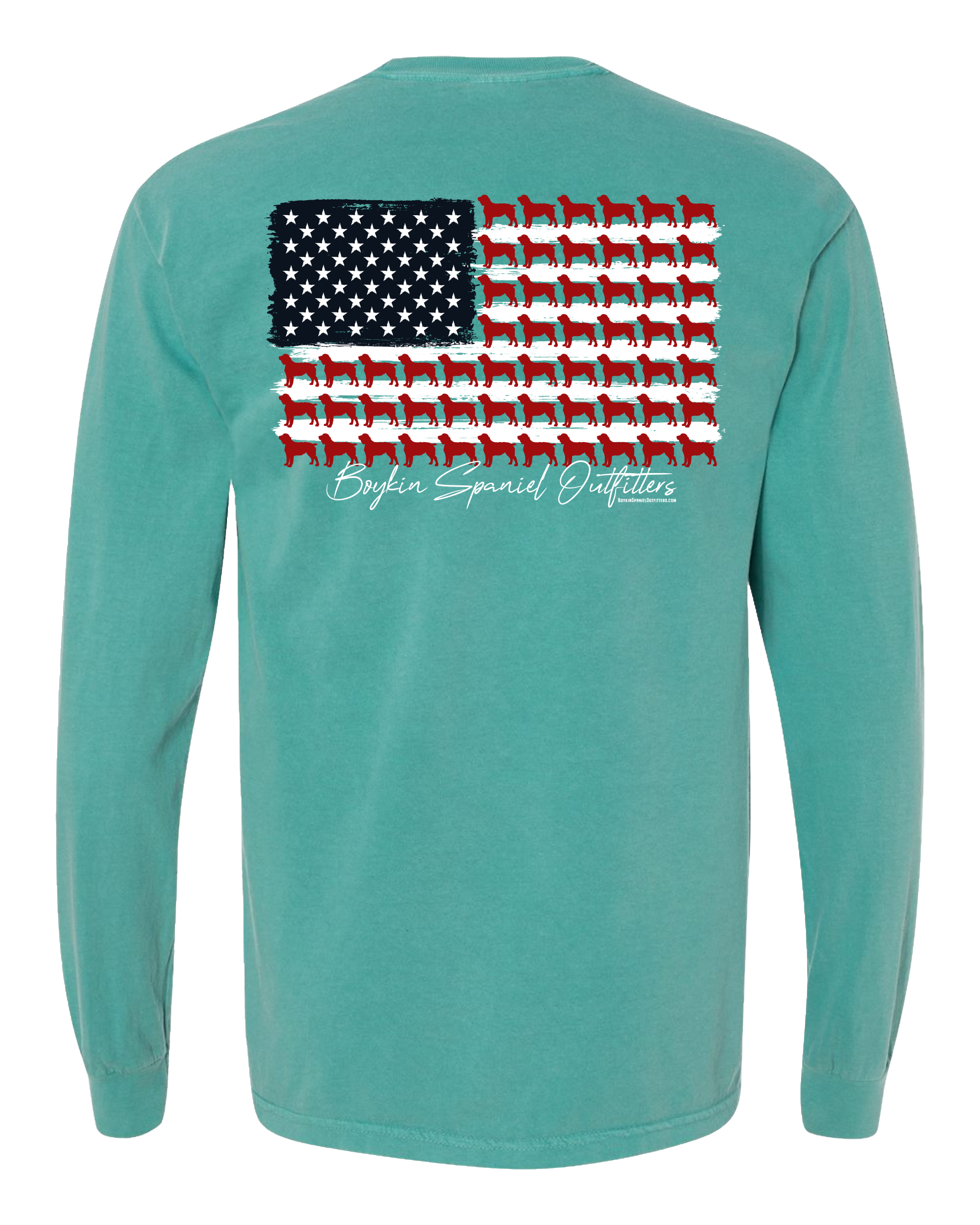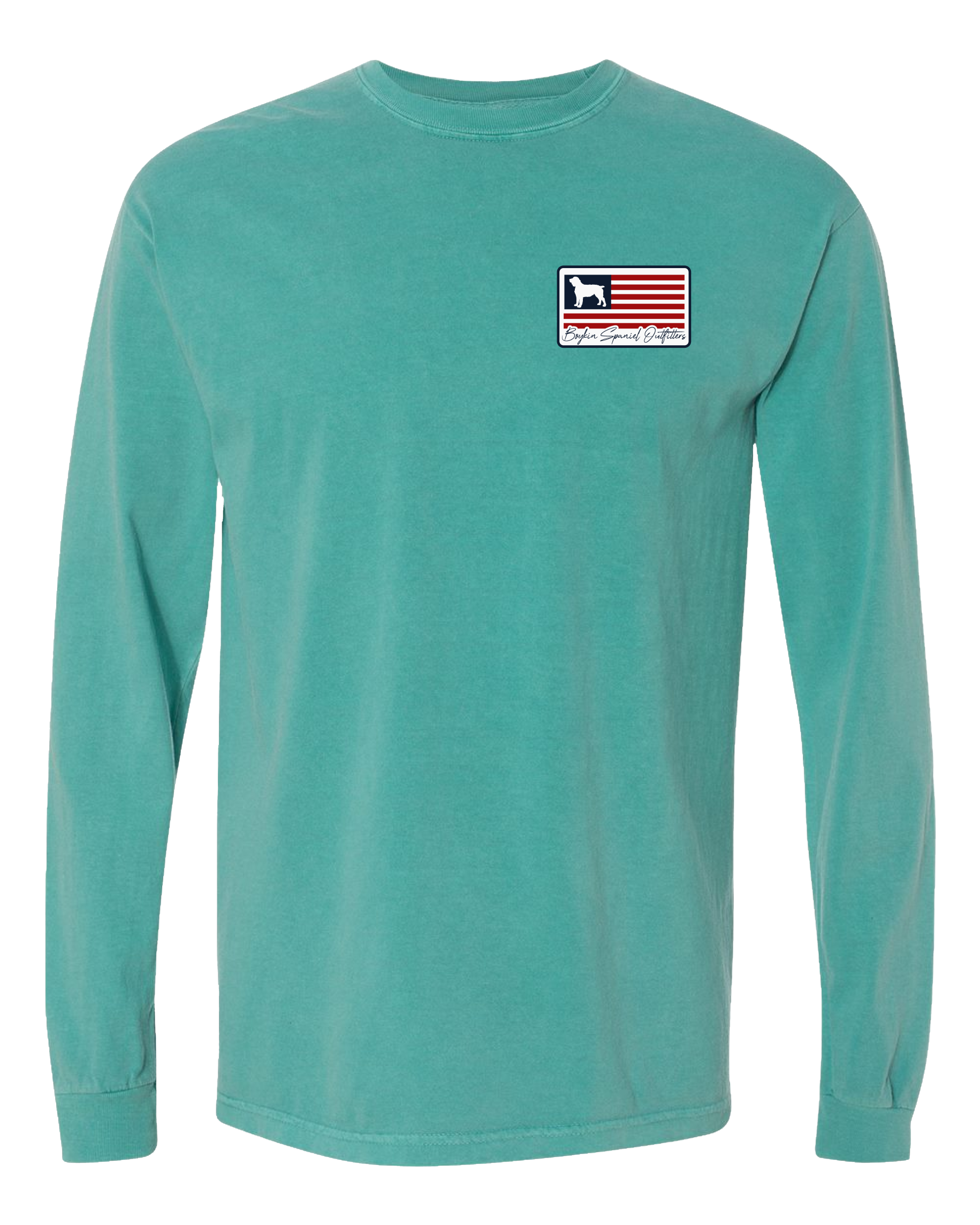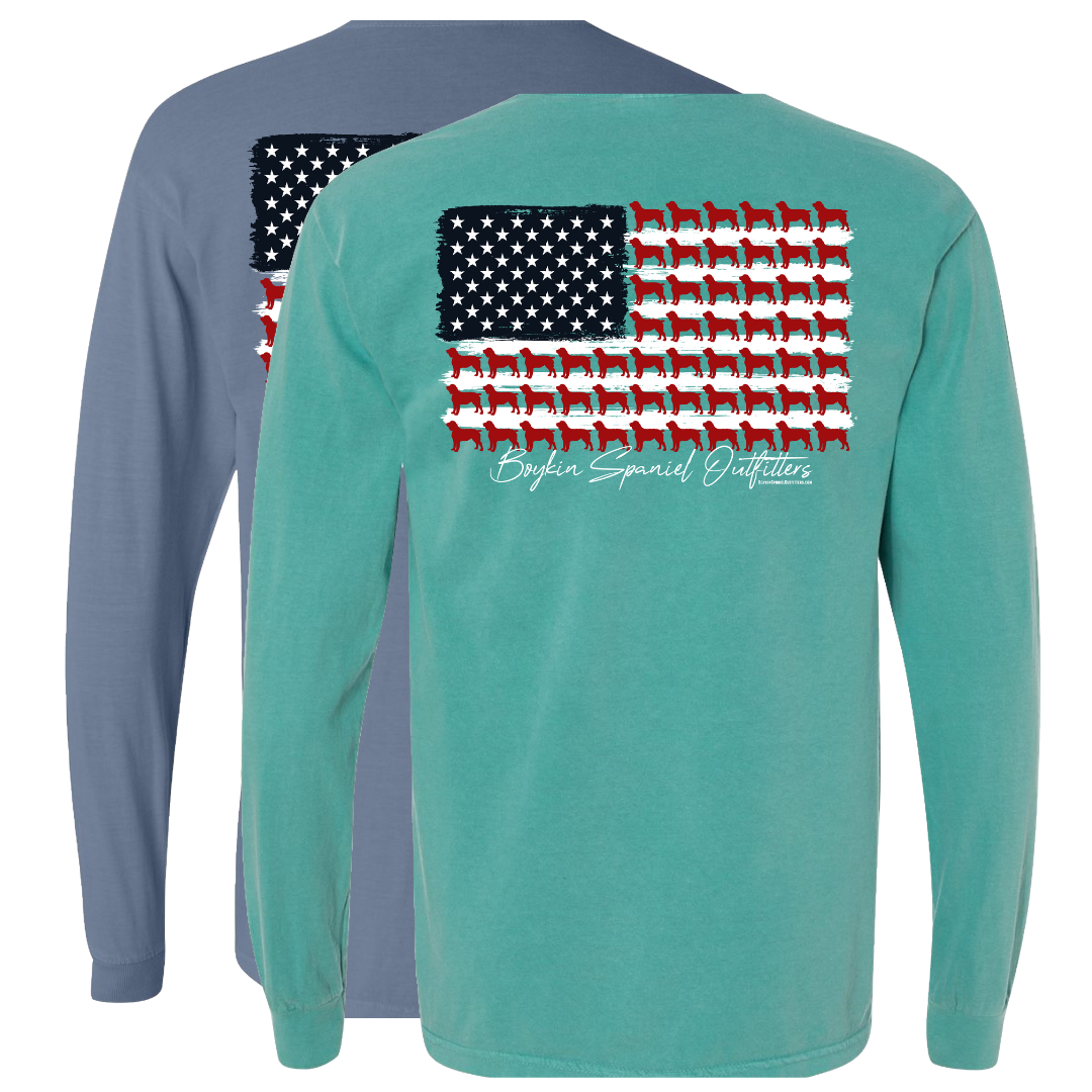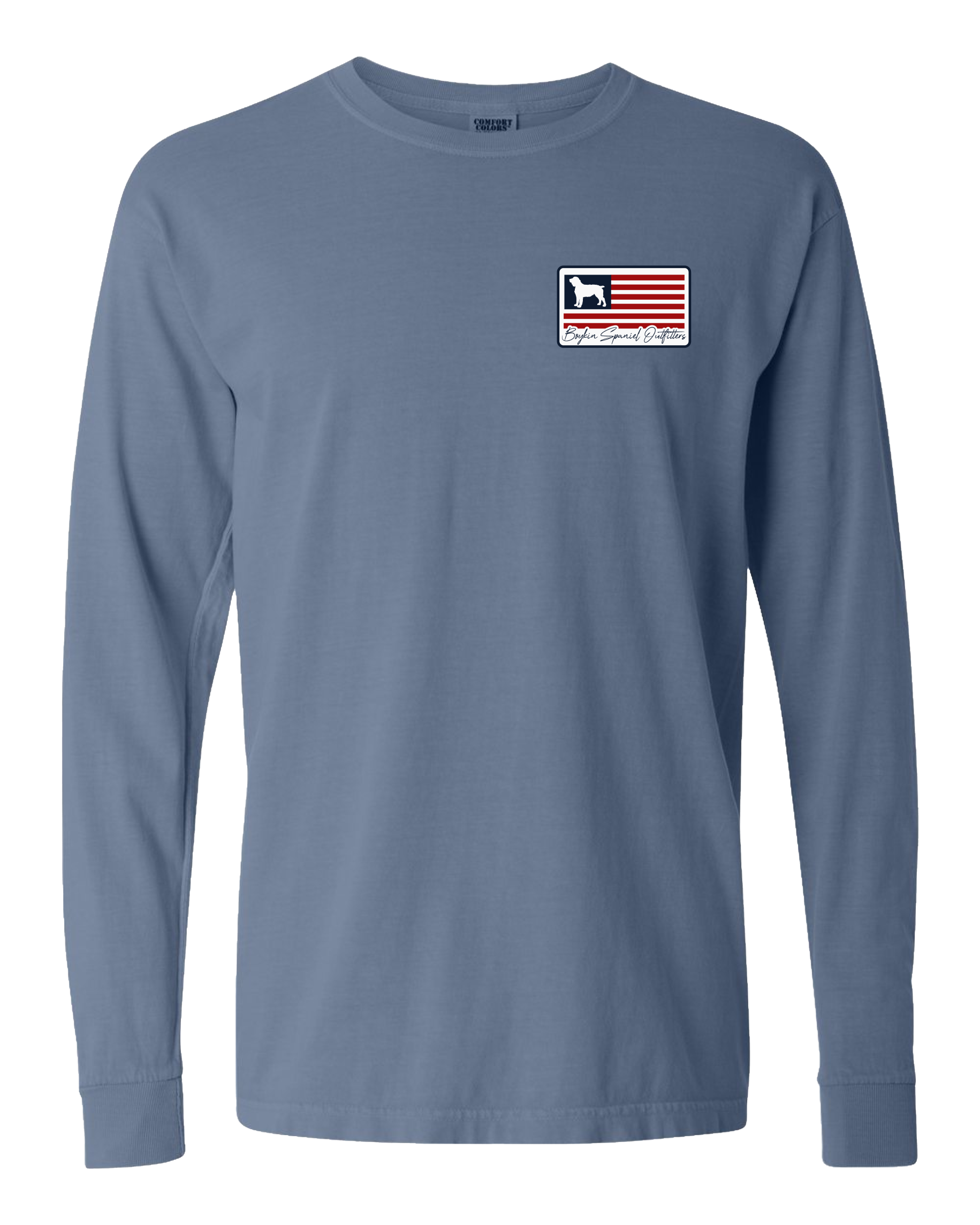 There's nothing like a broken in, well loved t-shirt, unless it's one that comes that way brand new! Our long sleeve Comfort Color tees are 100% ring spun cotton - perfect for those who need to limit sun exposure. Featuring our exclusive American Boykin design.