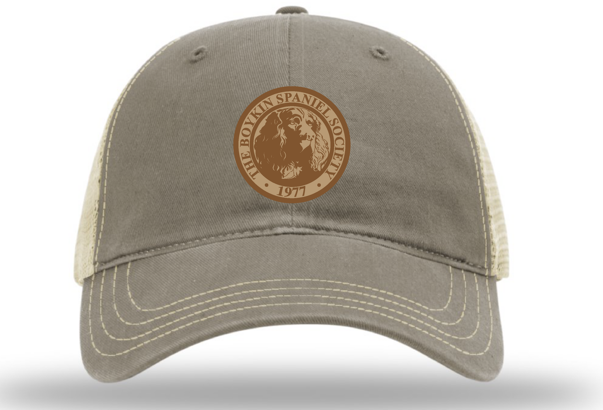 This garment-washed, mesh back trucker cap is all about comfort and fit. It features the official Boykin Spaniel Society official seal embossed on a leather patch.