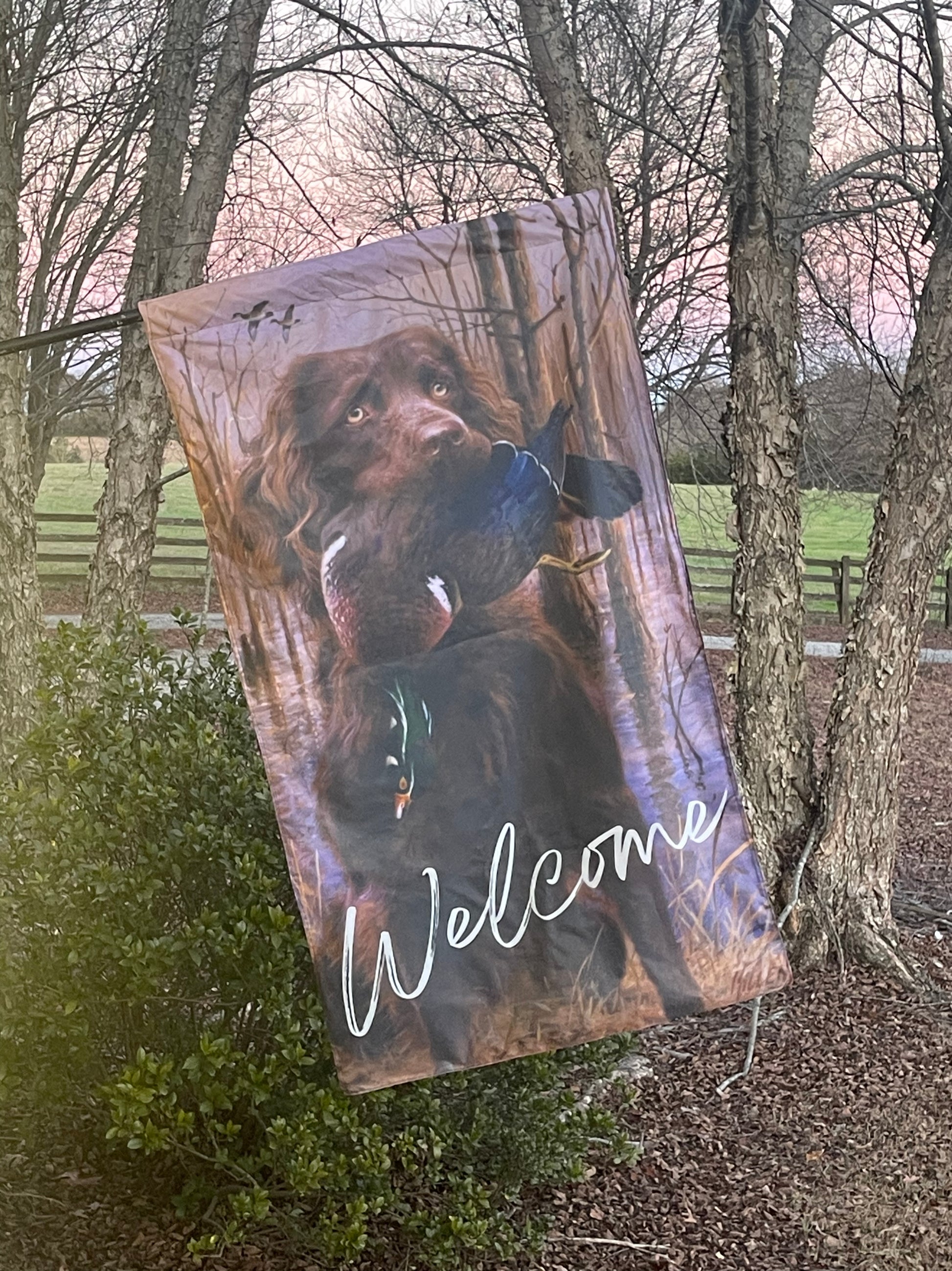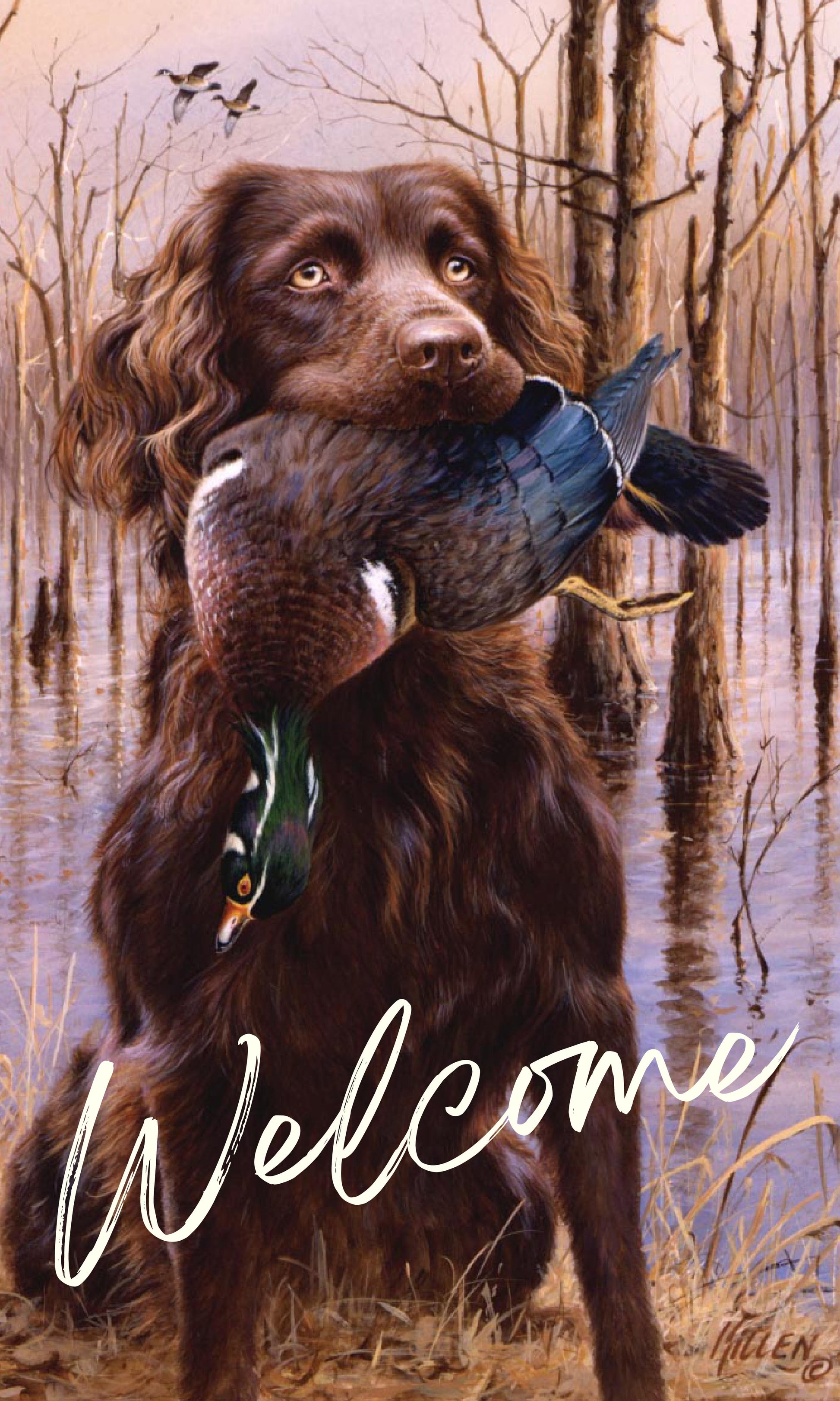 Boykin Spaniel Outfitters is thrilled and honored to offer a collaboration with award-winning master artist, avid sportsman, and dedicated conservationist Jim Killen. Jim's "Top Dog" artwork is featured on this high quality, double-sided 3 ft x 5 ft pole flag. This welcome flag is designed to be hung vertically, and includes a pole pocket across the width (3 ft) of the flag. Pole is not included. Flags are wrinkle resistant, fire retardant, and fully washable. Fabric is premium quality 2.1 oz polyester.