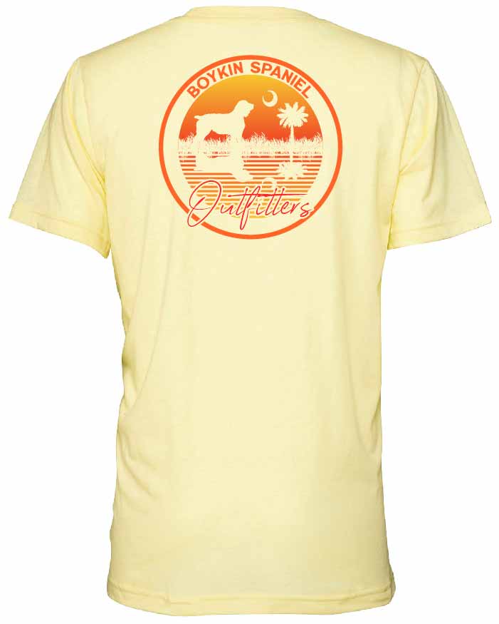 This beautiful design gives off beachy vibes with a South Carolina sunset featuring a Boykin Spaniel in silhouette.